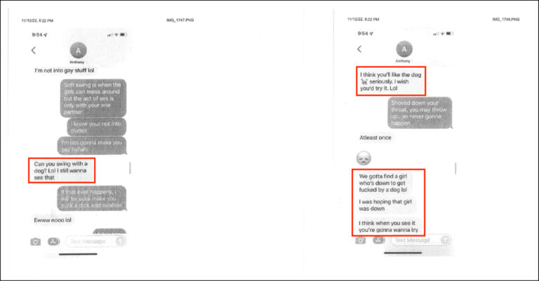 “Can you swing with a dog? Lol I still wanna see that…I think you’ll like the dog seriously. I wish you’d try it. Lol… We gotta find a girl who’s down to get fucked by a dog lol… I was hoping that girl was down… I think when you see it you’re gonna wanna try…”
